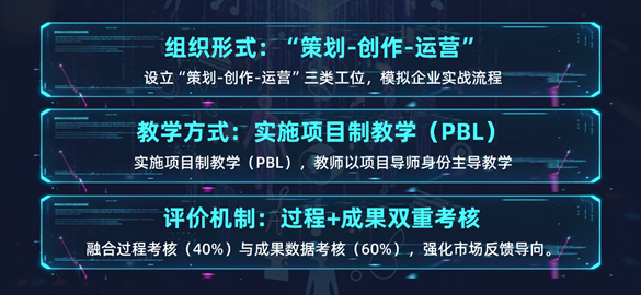 1.組織形式:設(shè)立“策劃-創(chuàng)作-運(yùn)營”三類工位,模擬企業(yè)實(shí)戰(zhàn)流程;